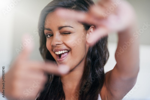Girl, finger frame and wink in home with portrait for photography symbol in morning sunshine. Woman, person and hands for shape, sign or emoji with smile for perspective with confidence in apartment