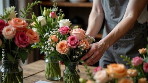 Girl florist collects a beautiful bouquet of flowers in a flower shop, close-up