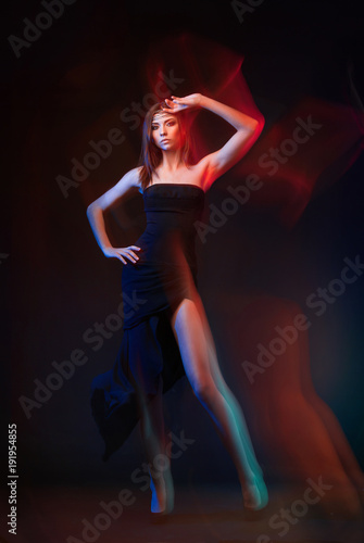 Girl, model photographed on a long exposure in the studio with color filters. Portrait, fashion, beauty, glow.
