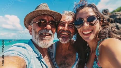 Girl takes a joyful selfie with her grandparents in a natural setting during a fun family vacation, capturing a happy moment and bonding experience