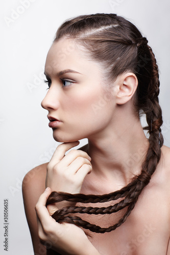 girl, woman, beauty, hair, coiffure, coiffure, braid, make-up, adult, beautiful, body, brunette, care, caucasian, clean, lock, coiffure, grey, european, face, fashion, female, fresh, curl, glamour, glamour, gorgeous, health, lady, make-up, model, people, portrait, make up, pretty, sensuality, skin, skincare, style, white, young, creative, arm, hand, sideview, attractive, elegant