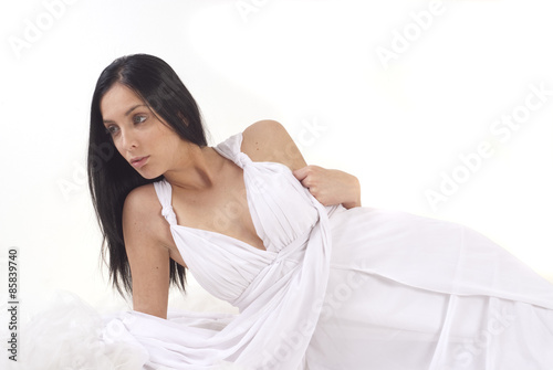 and, attractive, background, black, board, brunette, caucasian, fashion, girl, gorgeous, hair, holding, isolated, jacket, length, like, looking, model, person, portrait, pose, posing, pretty, princess, ring, serious, studio, white, with, woman, young, mask