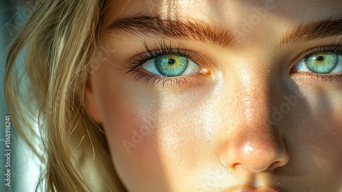 eye, face, girl, blue, freckle, portrait, sunlight, indoor, closeup, look, beauty, woman, young, skin, hair, blond, expression, natural, light, shadow, vision, female, person, gaze, view, teenage, youth, model, cosmetic, make-up, wellness, healthy, fresh, clean, care, detail, colours, iris, pupil, feature, head shot, glow, attractive, pretty, innocent, candid, emotion