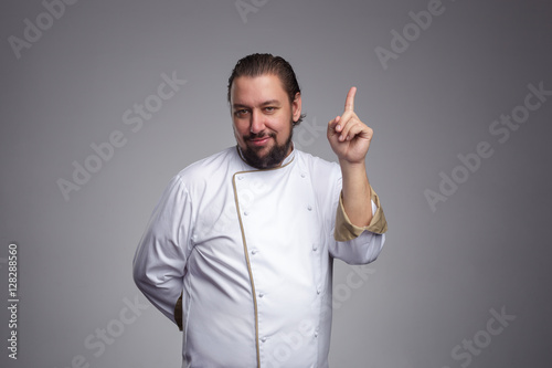 advice, finger, chef, idea, cook, staff, cooking, qualification, photogenic, white, wise, give, concept, life, adult, male, eatery, occupation, epicure, people, skill, caucasian, posing, portrait, grey, elderly, healthy, person, professional, pointing, attention, competent, cheerful, background, work, job, man, food, uniform, hand, giving, experienced