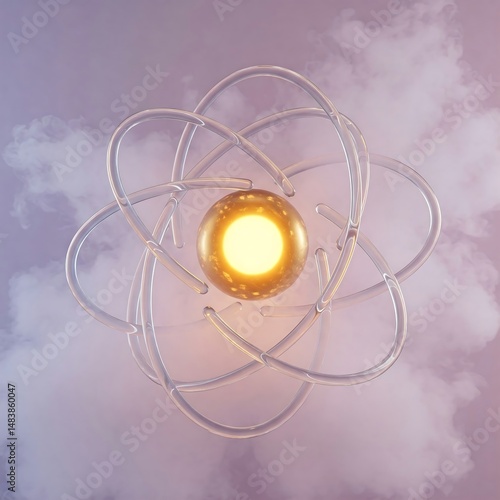 Glass arcs orbiting gold sphere diffused in pastel haze vapor light