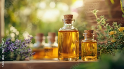 Glass bottles filled with oil are on a wooden surface