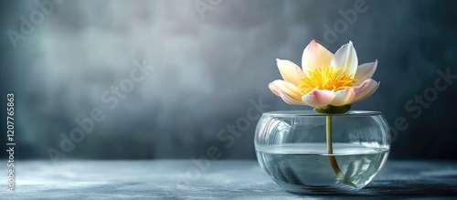 Glass Candle Holder Vase with Single Yellow Flower on Grey Background with Empty Copy Space for Text, Horizontal Composition, Soft Lighting