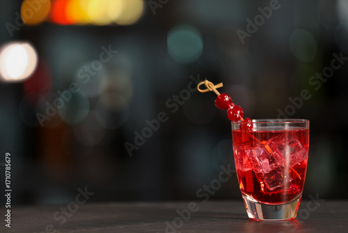 Glass of alcoholic cocktail with cherries on table against blurred background. Space for text