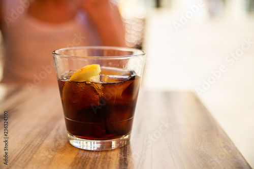 Glass of cola with ice and lemon on the table. Street cafe. Soft focus. Copy space