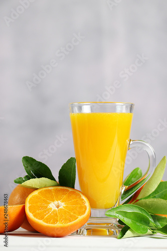 Glass of orange juice with oranges fruit on wooden table.
