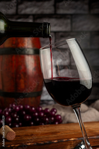 glass of red wine with a bottle of wine, falling into it with a wooden background and grapes