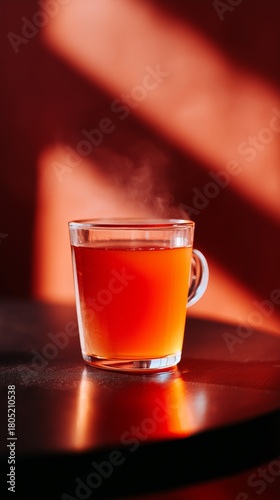 Glass of steaming apple cider on a dark reflective table, illuminated by warm light, creating a cozy atmosphere perfect for autumn gatherings and seasonal celebrations