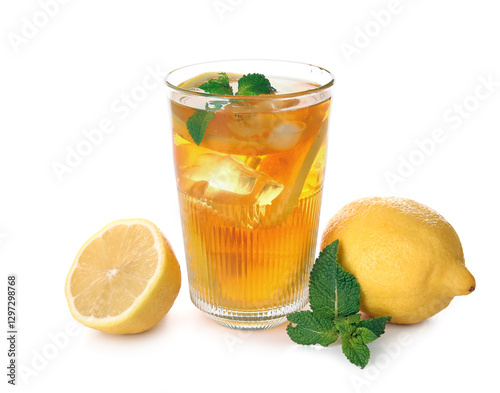 Glass of tasty cold ice tea with lemons and mint leaves on white background, closeup