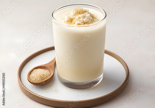 Glass of white smoothie with topping and wooden spoon on round tray.