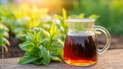Glass pitcher filled with tea beside fresh green leaves in a garden setting.