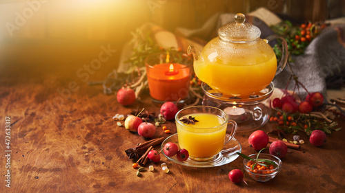 Glass teapot and cup with sea buckthorn tea with spices and autumn small crabapples on wooden background