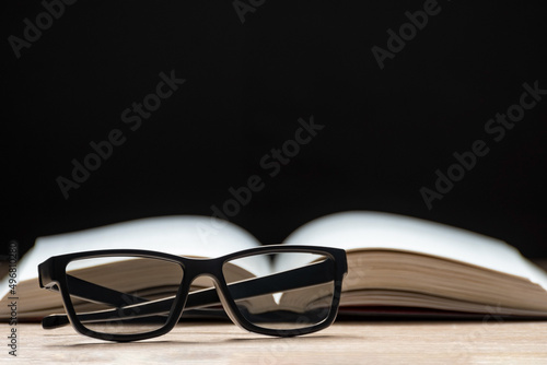 Glasses for vision and an open book lie on a table on a black background. Reading Glasses. Classic black frame glasses.