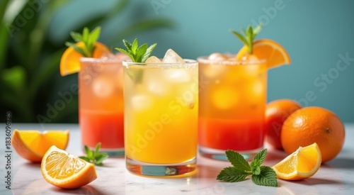 Glasses of orange juice with orange slices and mint