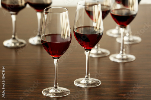 Glasses with red wine in a row on a table