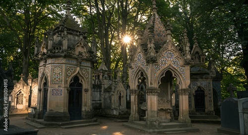 cemetery, grave, burial, memorial, gravestone, architecture, cemetery, structure, stone, mausoleum, sunlight, morning, tree, light, scenic, outdoors, serene, old, historic, aged, weathered, ornate, tile, design, detail, intricate, gothic, style, peaceful, quiet, death, remembrance, afterlife, resting, ground, up high, close, structure, shades, shadow, perspective, aesthetic, composition, artistic, background, natural, atmosphere, culture, ancient