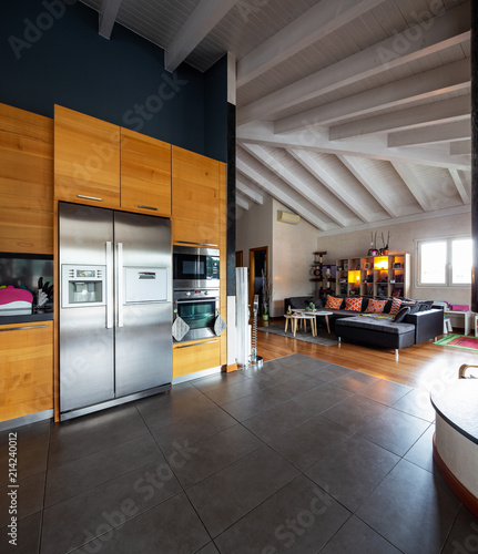 architecture, modern, design, home, house, apartment, attic, loft, nobody, empty, elegant, luxurious, luxury, interior, indoor, inside, room, wood, wooden, beam, parquet, kitchen, cooker, refrigerator, hood, microwave, oven, pantry, sink, stove, tap, open space, living, living room, sofa, couch, pillow, book, shelf, library