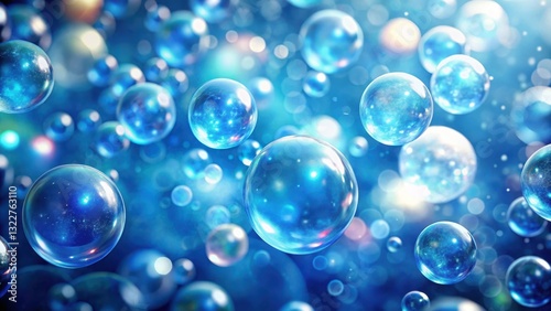 Glistening blue bubbles floating in mid-air with a soft, dreamy bokeh effect creating a sense of depth and atmosphere
