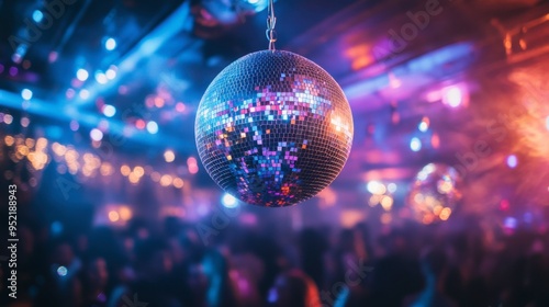 Glitter ball hanging from the ceiling at a dance club with colorful lights and a crowd below.