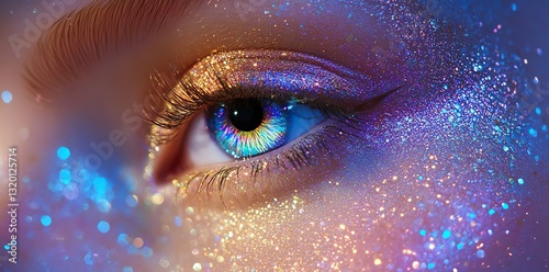 eye, make-up, glistering, sparkling, colourful, blue, purple, gold, closeup, beauty, fashion, cosmetic, glamour, glowing, iridescent, woman, female, eyeshadow, eyeliner, mascara, artistic, creative, vibrant, shimmering, party, festival, nightlife, celebration, fantasy, magical, dreamy, stylish, trend, beauty parlour, advertising, marketing, blog, website, editorial