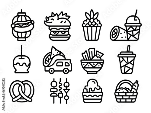 global, festival, food, outline, icon, set, food, lantern, hot dog, dragon, dumpling, burger, samba, popcorn, taco, sushi, neon, candy, apple, hybrid, truck, cultural