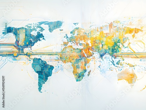 global, network, technology, digital, earth, map, circuit, connection, communication, cyberspace, datum, abstract, futuristic, modern, electric, innovation, graphic, design, artistic, vibrant, blue, yellow, orange, white, line, pattern, texture, background, illustration, artwork, style, concept, globalisation, travel, paint, art, wire, computer