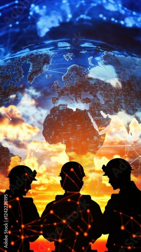 global, network, men at work, silhouette, sunset, teamwork, collaboration, connection, communication, technology, digital, earth, map, earth, cyberspace, datum, information, infrastructure, industry, energy, resource, mining, construction, engineering, professional, helmet, cooperation, oneness, globalisation, international, horizon, sky, cloud, orange, red, blue, light, dark, silhouette, background, image, graphic, design