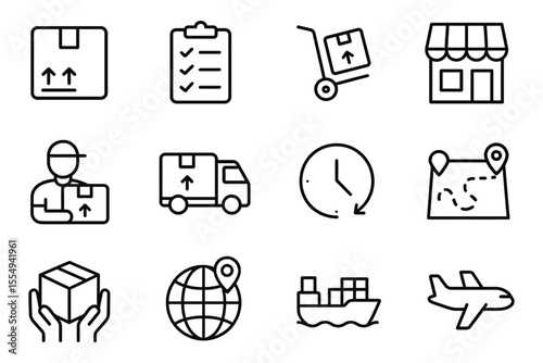 shipping, delivery, logistic, icon, package, outline, transportation, good, store, courier, truck, time, map, pin, box, globe, ship, aeroplane, tracking, distribution, service, online, commerce, retail, supply, international, transport, flat, design, vector, line, style