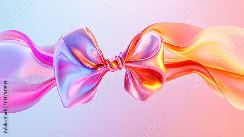 Glossy 3D bow with smooth ribbons in iridescent shades of pink, purple, blue, and yellow. evoke a modern and elegant feel.
