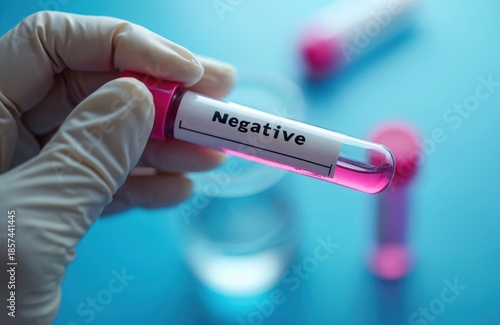Gloved hand holds vial with negative test result for disease. Medical laboratory research for virus or illness detection. Accurate scientific diagnosis.