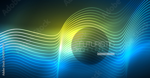 Glowing abstract wave on dark, shiny motion, Christmas and New Year magic space light. Techno abstract background