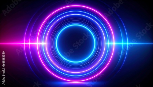 Glowing concentric circles of neon pink and blue light against a dark background