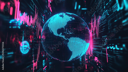 Glowing digital globe with vibrant pink and blue data points, symbolizing global connectivity and advanced futuristic technology in a high-tech setting