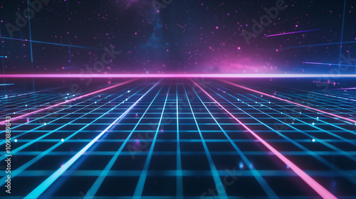 glowing futuristic grid background stretching into infinity, illuminated by vibrant neon blues, purples, and pinks,digital particles and soft light flares to evoke a cyberpunk atmosphere