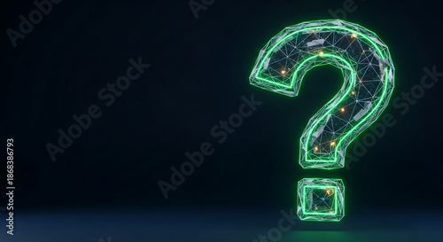 Glowing green question mark, polygonal mesh structure, on dark background, representing uncertainty, inquiry, or technology, against doubt or search