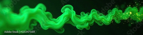 Glowing green smoke drifts across the black background, leaving behind a trail of glittering sparks, colorful, bright
