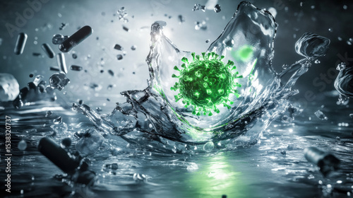 Glowing Green Virus Particle in Translucent Fluid Surrounded by Organic Debris Symbolizing Transmission of Hepatitis A