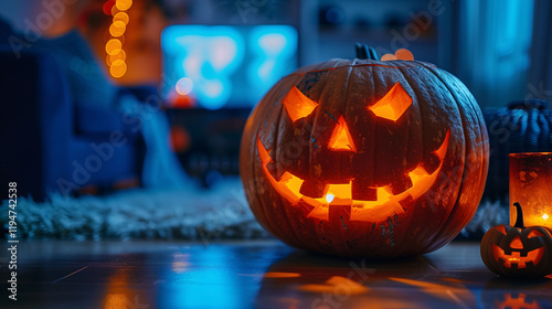 Glowing Halloween Pumpkin in Cozy Room