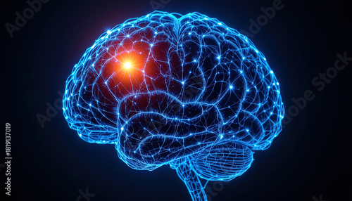 Glowing human brain illustration showcasing neural activity and cognitive function, ideal for science, medicine and technology concepts in a modern design