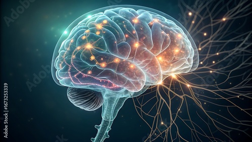 Glowing Human Brain Model Illustrating Neural Networks and Cognitive Function Exploring Artificial Intelligence and Neuroscience Research