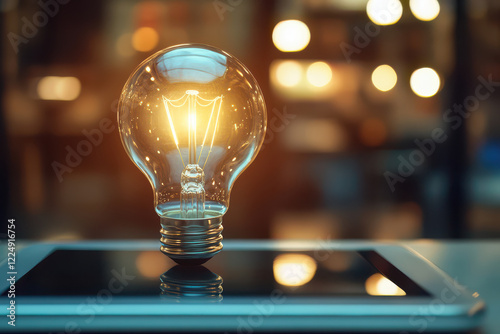 glowing light bulb displayed on tablet screen, symbolizing innovation and technology. warm light creates cozy atmosphere, highlighting creativity and modern design