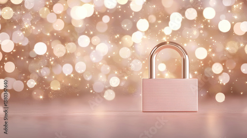 glowing padlock stands against soft, defocused background of golden bokeh lights, creating sense of security and warmth. shimmering lights enhance overall aesthetic appeal