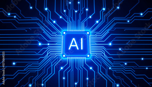 Glowing Purple AI Chip on Blue Circuit Board, Symbolizing Advanced Artificial Intelligence Technology.