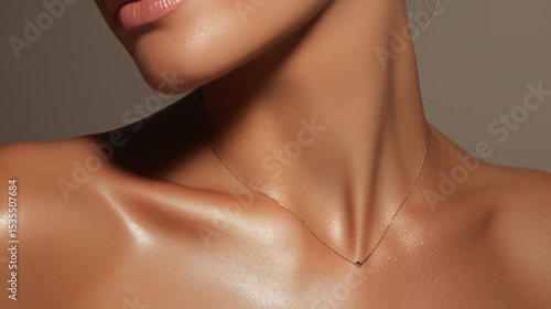 Glowing skin on chest and clavicle area with delicate necklace, highlighting smooth and radiant skin texture in close up beauty shot