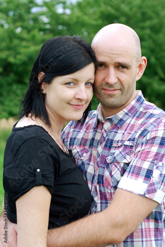 couple, lover, enamoured, man, woman, smile, smiling, summer, happy, spring, spring, outdoors, meadow, european, european, relation, partnership, common, together, bald, stubble, unshaved, person, person, heterosexual, man, people, contented, feel good, excursion, nature, countryside, love, love, confidence, familiar, affection, friends, friends, hold, hug, holding