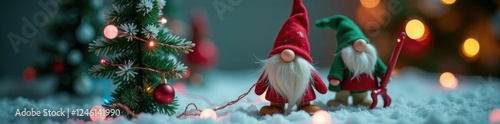 Gnomes in green and red clothing arrange a miniature Christmas tree with soft pink and blue fairy lights, decorative items, pink